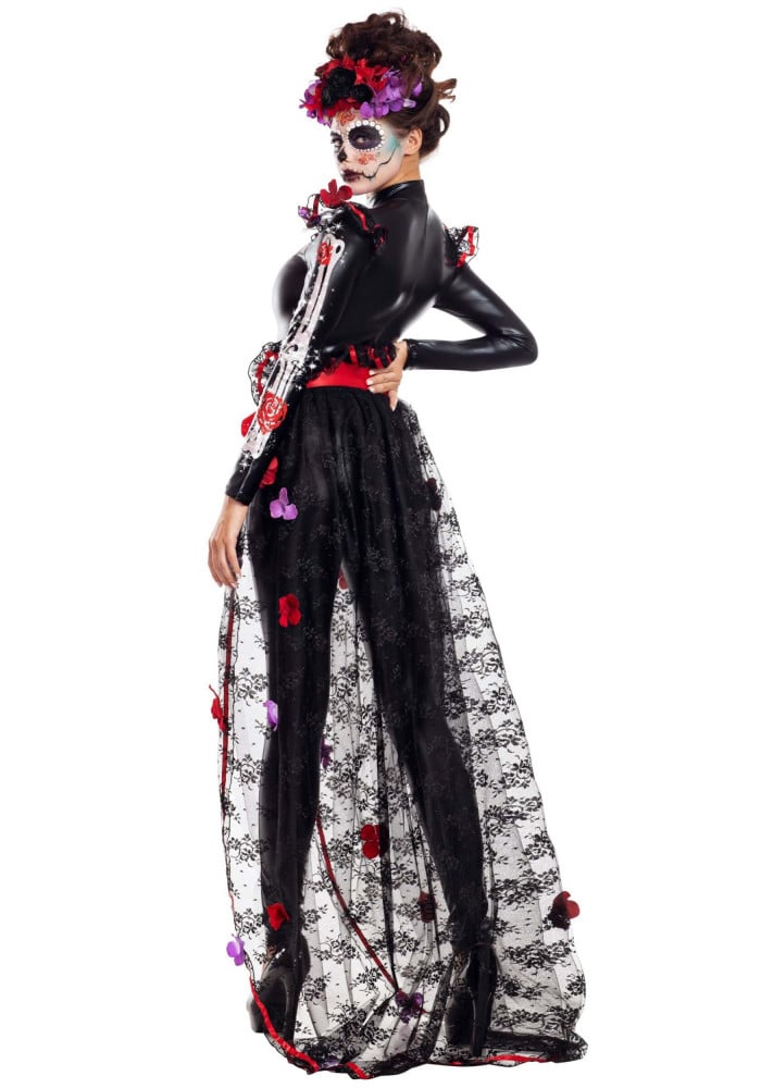 - بدلة ذات مظهر رطب لامع ، كشكش كتف من الدانتيل مع حواف الشريط وزهور النسيج