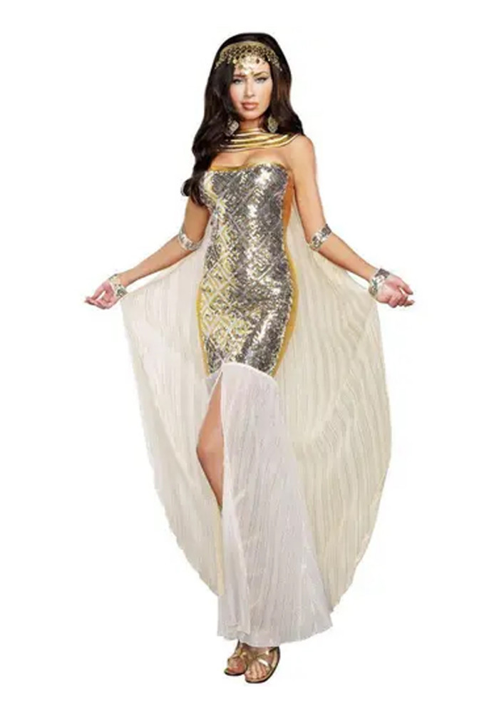 يشمل المنتج:فستان مزين بالترتر مع أحزمة قابلة للإزالة / قابلة للتعديلرداء شيفون بطيات مع أربطة ذراع مرفقةغطاء رأس عملة ذهبية